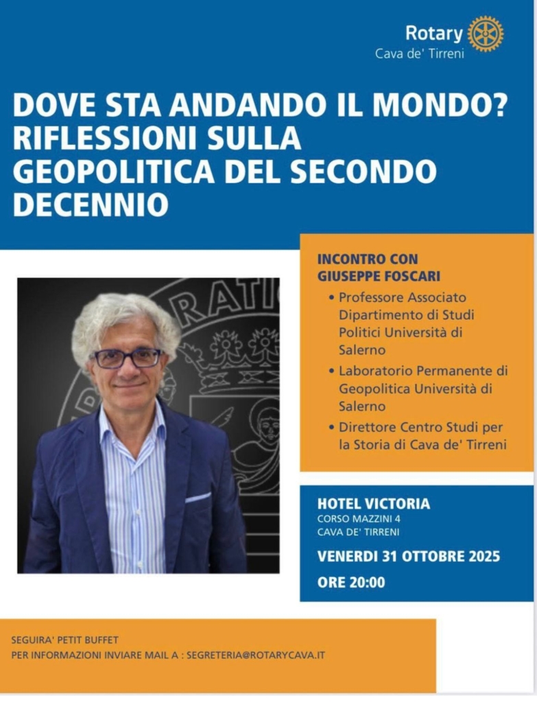 Venerdì 31 ottobre, all’Hotel Victoria Maiorino di Corso Mazzini 4 di Cava de’ Tirreni – sede del Club Rotary – si è tenuta una stimolante “lezione” di Geopolitica con il Professore Giuseppe Foscari. Nato a Cava de’ Tirreni, laureato in Scienze Politiche, docente di storia moderna e contemporanea all’Università di Salerno (dove dirige anche il laboratorio politico – economico) e Direttore del Centro Studi per la Storia di Cava de’ Tirreni (contribuendo attivamente alla valorizzazione del patrimonio storico locale), infatti, a tal proposito, è l’autore di numerose ricerche e pubblicazioni che trattano argomenti come: la storia locale di Cava de’ Tirreni, compreso il disastro del 1773; la politica e la modernizzazione nel Regno delle Due Sicilie ed eventi storici specifici come la rivolta di Masaniello. Dunque, un venerdì all’insegna dell’ascolto dove il Professor Foscari, per l’appunto, ha pungolato la curiosità della platea raccontando l’evoluzione della Geopolitica nelle civiltà europee mettendo in evidenza l’instabilità delle politiche internazionali. Presenti a questo importante incontro rotariano, oltre al Presidente Pasquale Montuoro e la Tesoriera Danila Fasano, che ha provveduto ai saluti istituzionali, una folta platea dei soci del Rotary Club Cava. Il dibattito, è stato moderato dalla giornalista Martina Farina.