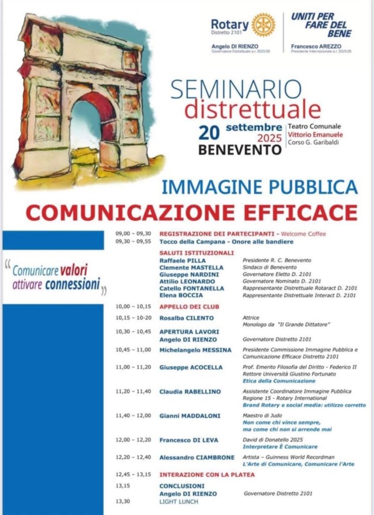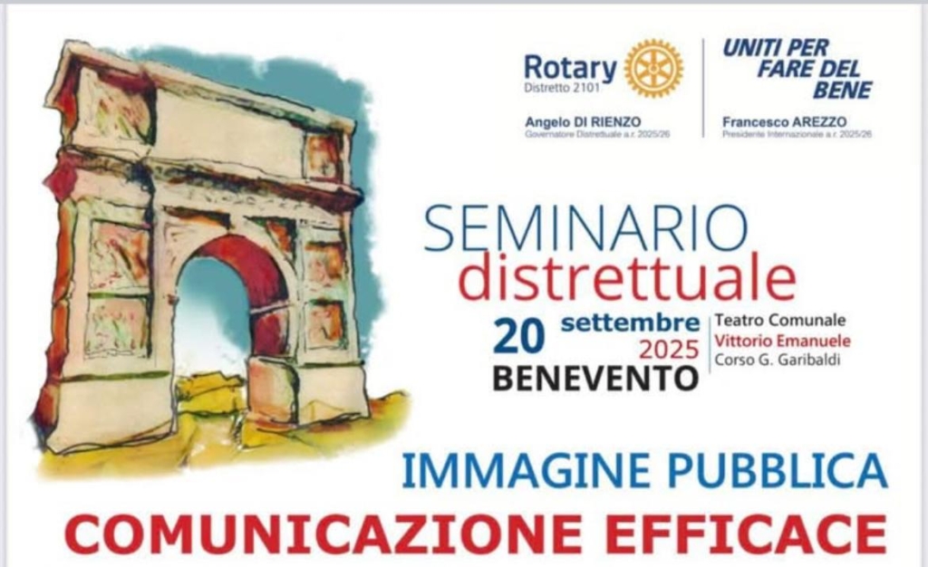 Si è svolto il 20 settembre 2025, al Teatro Comunale Vittorio Emanuele di Benevento, un importante seminario del Distretto 2101 Campania del Rotary sull’Immagine Pubblica e sulla Comunicazione Efficace.